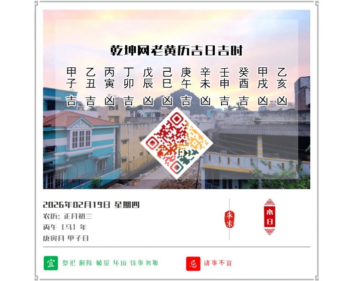 老黄历提醒:今天是公历2026年2月19日,农历正月初三,干支为丙午庚寅甲子,当天吉神青龙值日,是一个黄道吉日。在择日上优先选择【宜】做之事,但凡适合的用事在这天举行则能顺风顺水。